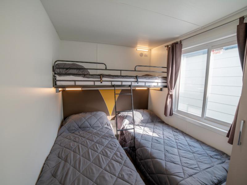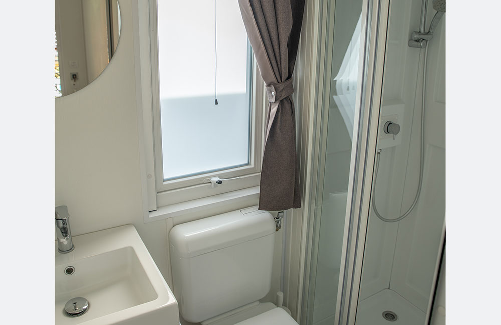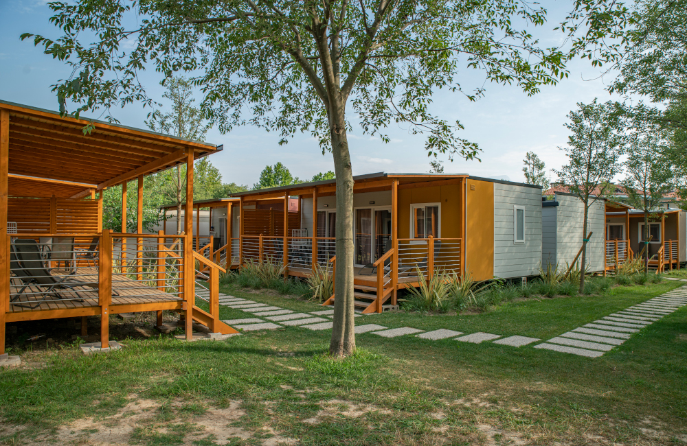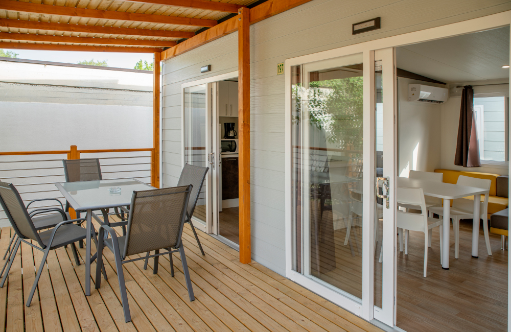 Er is een slaapkamer met tweepersoonsbed en een slaapkamer met twee eenpersoonsbedden en een opklapbed; twee privé badkamers, compleet met douche, toilet, wastafel, haardroger en kastje; woonkamer met kitchenette gelegen aan de voorzijde om zo op de beste manier te kunnen genieten van de buitenruimte van de veranda en een bank en elegante inrichting. De structuur is op verzoek voorzien van airconditioning. De privéparkeerplaats maakt het aanbod compleet.